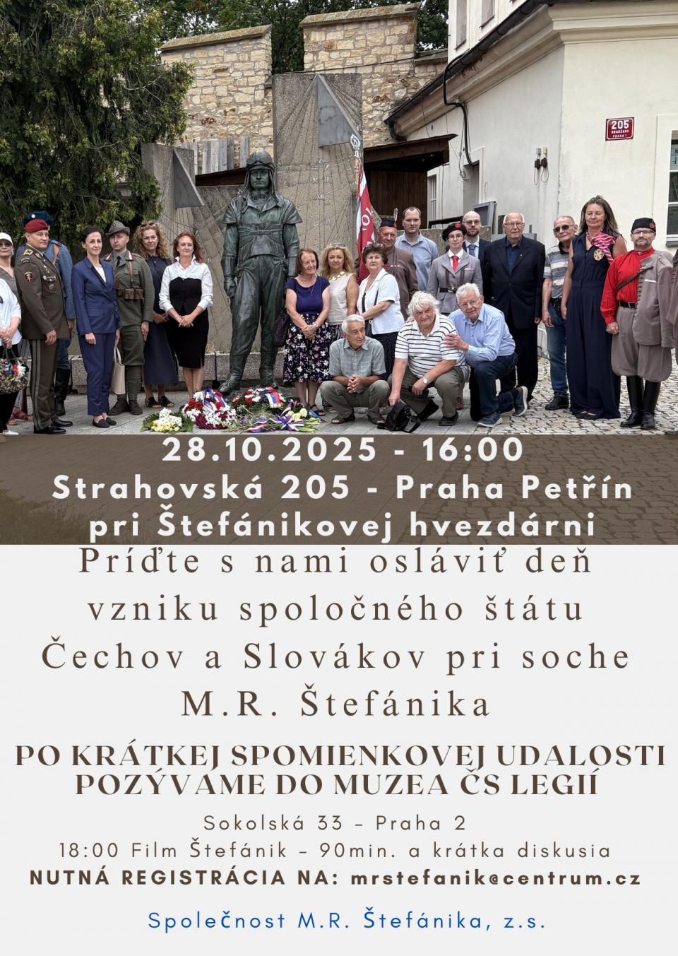 Pozývame na spomienkovú udalosť oslavy Dňa vzniku Československej republiky dňa 28.10.2024 o 16:00 pred sochou M.R.Štefánika na Petříně. Upozorňujeme, že lanovka nepremáva, odporúčame vystúpiť na zastávke MHD Koleje Strahov.